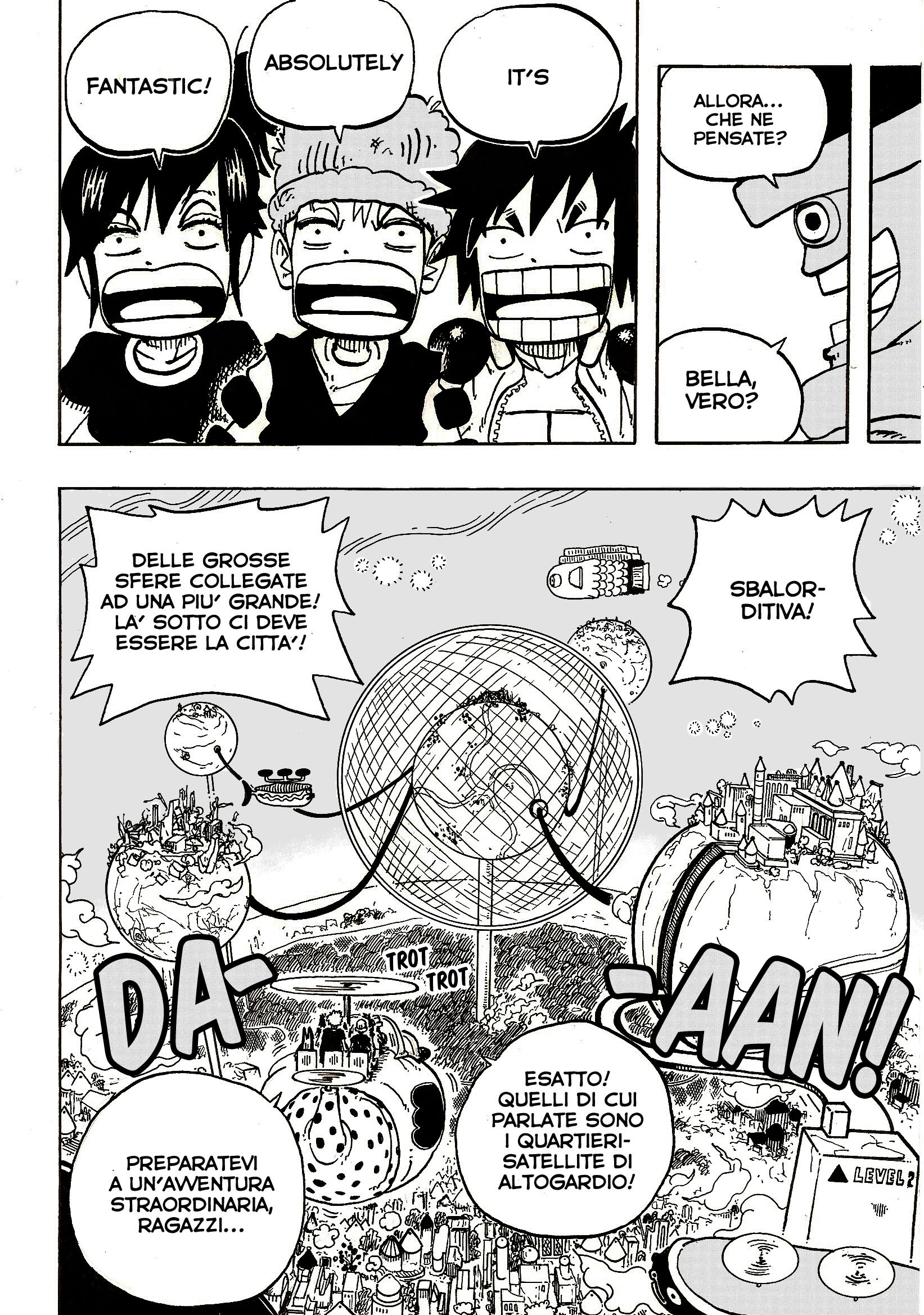 In questo capitolo i ragazzi si imbarcano verso la loro meta, il Mondo Fluttuante. Questo luogo è un vero e proprio mondo che fluttua nel cielo e che ha una propria atmosfera. In esso animali e piante si sono evoluti per poterci vivere e alcuni di questi animali si sono ulteriormente evoluti per poter essere usati come dei mezzi di trasporto dagli umani che vivono su quest’isola nel cielo(ogni riferimento a manga pirateschi è puramente casuale). I ragazzi giungono nel mondo fluttuante grazie ad un enorme ascensore che si innalza nel cielo ad una velocità spaventosa. Arrivati a destinazione il gruppo di giovani guerrieri entra nel mercato di Altogardio, questo il nome della città sospesa(Nome che il mio cervello associa, non so perché, ad una delle città che si potrebbero trovare nel mondo de Il Signore degli Anelli). Dopo un giro nel mercato, dove i ragazzi hanno assaggiato alcune prelibatezze locali, chi più chi meno, il gruppo incrocia il cammino di un losco figuro che li riconosce subito. Egli fa parte dell’esercito reale e dichiara i due Guardiani del Mondo, Eichi e Ryoda, nemici del regno.
