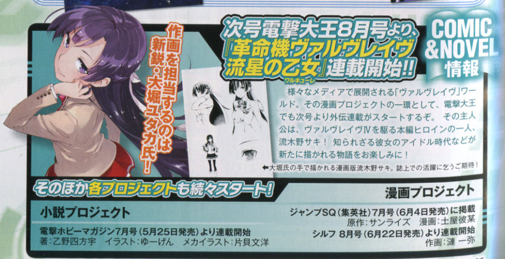 Il numero di Luglio della rivista Monthly Comic Dengeki Daioh edita dalla ASCII Media Works e uscito domenica della scorsa settimana ha rivelato che dall’anime di Valvrave the Liberator (Kakumeiki Valvrave) sarà tratto un manga dedicato al personaggio di Saki Rukino la cui pubblicazione comincerà sul prossimo numero di Monthly Comic Dengeki Daioh, in vendita a Giugno. Il manga si intitolerà Kakumeiki Valvrave Ryūsei no Valkyrie (Valvrave the Liberator: Shooting Star Valkyrie) e racconterà la storia di Saki Rukino durante il periodo il cui quest’ultima era una idol oltre a vari altri avvenimento. Il manga sarà disegnato da Yutaka Ōhori.
