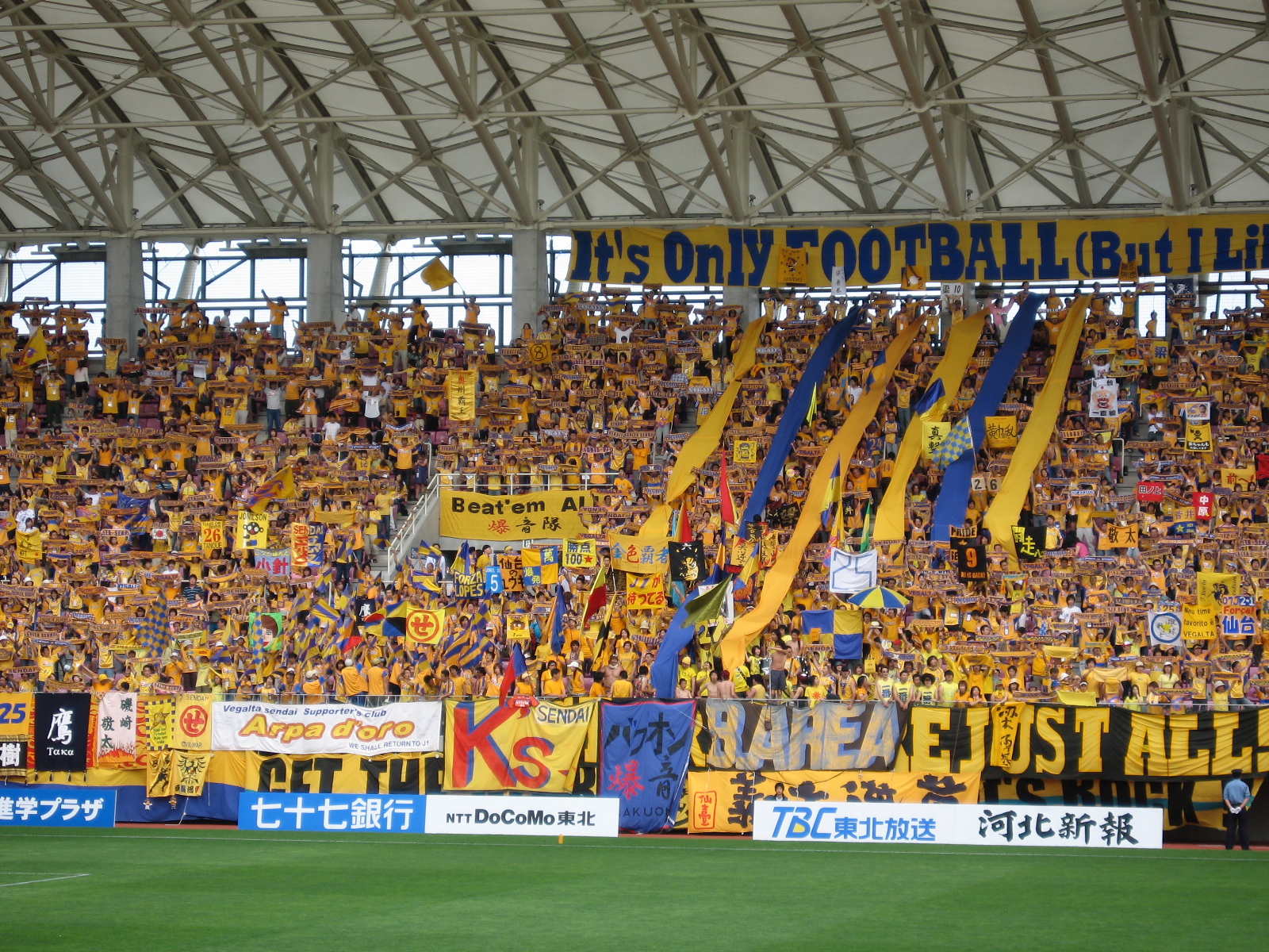 Questa notizia, per quanto potrebbe sembrare frivola, dimostra come la vita vada avanti nonostante tutto. In questo caso, per un popolo che ha subito così tanti danni, il ritorno del campionato di calcio è come un tornare alla vita. I giapponesi, come sappiamo, hanno una grandissima passione per il calcio. Molte persone considerano il calcio uno sport brutto ed inutile, comandato dai soldi e dalle televisioni. Non sta a me giudicare questo sport, ma in Giappone, soprattutto dopo questo tragico mese, il ritorno del campionato di Divisione 2 della J.League dimostra che l’efficienza giapponese tende ad accontentare non solo i bisogni primari dei cittadini, ma anche le esigenze di svago del popolo. La città di Sendai torna a sorridere dopo il dramma dello scorso 11 marzo. La sua squadra principale, il Vegalta, si è imposto per 2 -1 sul Kawasaki Frontal della prefettura di Kanagawa a sud di Tokyo. La squadra, dopo un inziale svantaggio, si è portata sul 2 ad 1 grazie ai gol di Yoshiaki Oda e del difensore Jiro Kamata nel finale di partita. L’affluenza allo stadio è stata notevole. I coloratissimi tifosi del Vegalta sono arrivati in molti e hanno tifato senza sosta per tutti i novanta minuti. Come non apprezzare un tale entusiasmo dopo una tragedia di quelle proporzioni!?