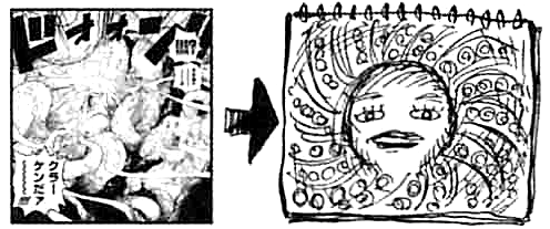 - Viene mostrato lo schizzo che Robin fa del Kraken nel capitolo 605 … Notiamo quindi che Rufy è in buona compagnia come abilità di disegno …