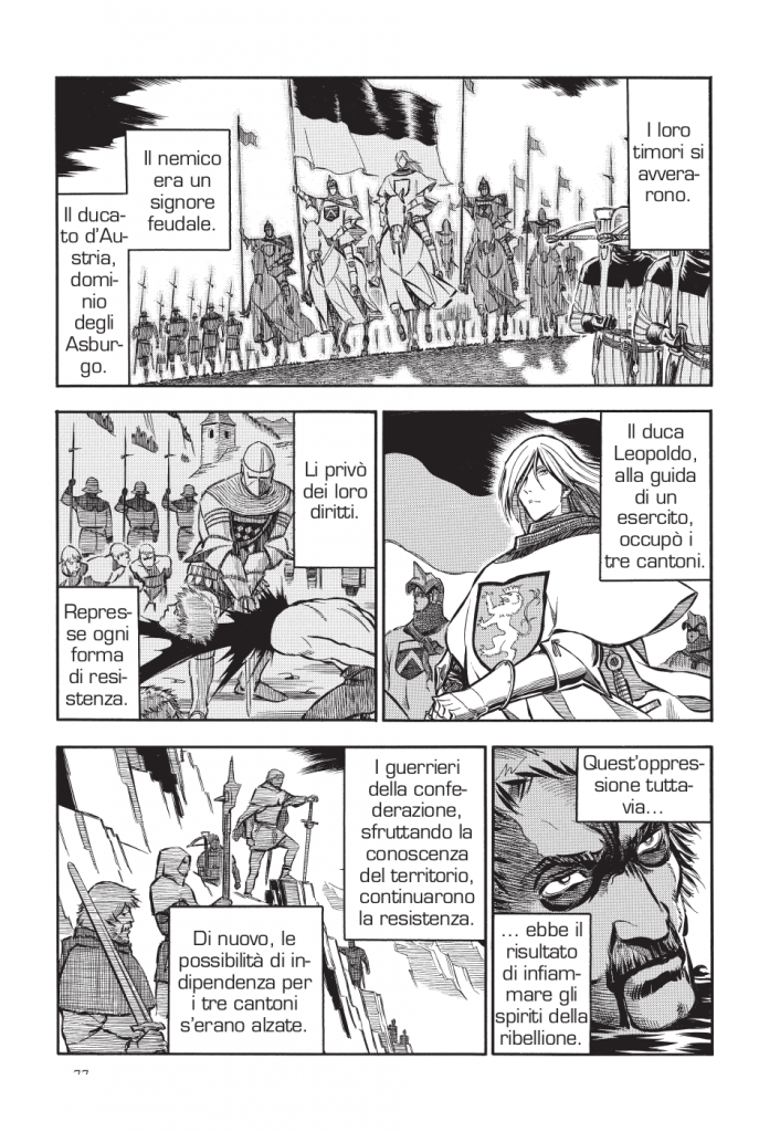Veniamo quindi al periodo attuale, nel manga. La resistenza è viva, ma sprovvista di grossi mezzi per opporre resistenza e perciò tenta di far uscire alcuni membri dai tre cantoni occupati per andare a cercare aiuto all’esterno in modo da organizzare una resistenza che liberi i cantoni da fuori. Il problema in tutto questo è il balivo di Wolfsmund, chiamato Wolfram.