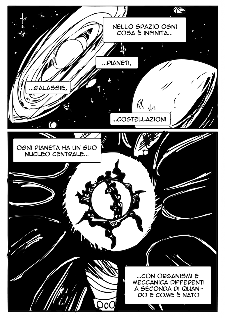 Nell’articolo di presentazione sotto “trama” ho scritto: “Nello spazio ogni cosa è infinita… Pianeti…Galassie…Costellazioni. Ogni pianeta ha un suo nucleo centrale…con organismi e meccanica differenti a seconda di quando e come è nato.” Queste sono le parole presenti nella prima pagina del capitolo, parole che la stessa autrice ha deciso di utilizzare per presentarci il suo lavoro.