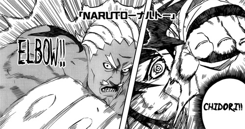 Il capitolo si è trasformato fin da subito in uno scontro di Wrestling dove il forte e veloce Raikage ha la meglio verso tecniche ed occhi stralunati. La mossa finale mi fa credere che abbia alcune grosse lacune nel Ninjutsu e nelle tecniche in generale tuttavia non ne possiamo essere certi: il raikage ha dimostrato poca pazienza e lungimiranza, quindi
