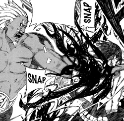 E’ giunto il momento per Sasuke di perdere un po’ di diottrie: l’amanteratsu viene scagliato continuamente verso il Raikage che, con la sua estrema velocità, riesce a schivare la tecnica. La domanda è… per quanto? Ma ecco che il kage passa all’attacco. Sasuke, da ragazzo intelligente, si protegge con un muro di fiamme nere tuttavia il Raikage preferisce condannarsi un braccio piuttosto che evitare di sconfiggere Sasuke.