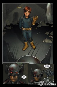Molti di voi avranno notato il richiamo nel titolo fatto al quarto film di Star Wars e la celeberrima saga mutante ma al contrario di quanto potreste pensare non parliamo del film degli uomini X ma della saga di Messiah War. Come abbiamo già detto qualche tempo fa Ciclope ha deciso di mandare la X-Force in viaggio nel tempo per avere notizie di suo figlio e della Messiah visto che l’assenza dei due si è prolungata ben oltre le aspettative dell’attuale leader del mondo mutante. Finalmente riusciamo a vedere i primi spezzoni dell’incontro tra Cable e il duo artigliato. La scena che ha del comico è quella che vede protagonista Wolverine che sta per dire una parolaccia davanti alla bambina con Nathan che gli punta una pistola alla tempia, come se fosse un deterrente, intimandogli di moderare il linguaggio e di Laura che a sua volta punta un artiglio alla gola di Cable dicendogli di buttare a terra la pistola prima che Warpath intervenga a sedare la giovane mutante; naturalmente si tratta di una gag comica visto che i rapporti tra di loro sono di collaborazione dato che pare essersi sulle tracce della piccola, della quale finalmente scopriamo il nome, anche Stryfe che sappiamo essere un osso veramente duro il quale ha avuto a che fare con Cable in moltissime occasioni. Altra immagine che è venuta fuori è quella che vede X-23 e Logan trovarsi faccia a faccia con una tizia completamente ustionata in mimetica che punta una siringa ( un nuovo virus?) alla gola di una ragazza bionda vestita completamente di rosso. Nel frattempo sembra che la tensione tra Emma Frost e Scott stia salendo sempre più, con degli scheletri nell’armadio, per entrmabi, che sono sul punto di far scoppiare la coppia che però devo dire nel corso di quest’ultimo periodo mi ha particolarmente divertito, speriamo resista ancora un pò. Ora vi lascio alle considerazioni più divertente su come la bimba sia diventata così grande in così poco tempo… ah quasi mi dimenticavo… volevate sapere il nome della Messiah… naturalmente si chiama Hope.