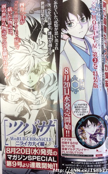 Il primo capitolo del manga di xxxHOLiC: Rei sarebbe dovuto uscire a febbraio del 2013, solo per essere effettivamente pubblicato all’inizio di marzo, qualche mese dopo l’annuncio fatto dalle CLAMP circa l’interruzione di due manga, Drug & Drop e Gate 7, dovuti a gravi problemi di salute di una delle autrici. La Kodansha ha raccolto i primi capitoli di xxxHOLiC: Rei in tre volumetti, l’ultimo dei quali è uscito il 20 agosto dell’anno scorso. Lo stesso giorno, sulle pagine della rivista Magazine Special, ha fatto il suo debutto un nuovo manga delle CLAMP intitolato Tsubasa WoRLD CHRoNiCLE: Nirai Kanai-hen. Weekly Young Magazine sta pubblicizzando Tsubasa WoRLD CHRoNiCLE: Nirai Kanai-hen come una nuova storia di Tsubasa collegata a xxxHOLiC: Rei.