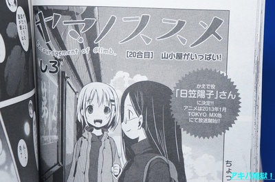 Il sito web della rivista dedicata ai manga Comic Earth Star a Giugno di quest’anno aveva fatto sapere che, in occasione della pubblicazione del primo volumetto del manga Yama no Susume, scritto e disegnato da Shiro, era stato dato l’annuncio di una prossima trasposizione animata del manga stesso prevista per il 2013.