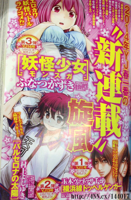 Kazuki Funatsu (Curry naru Shokutaku) è l’autore della terza e ultima delle nuove serie, intitolata Yōkai Shōjo -Monsuga- (La ragazza mostro -Monsuga-). Il manga è una commedia romantica in cui la protagonista, una ragazza eroticamente carina, nasconde un segreto inquietante dietro la sua bellezza. Il primo capitolo del manga di Yōkai Shōjo -Monsuga- sarà pubblicato sul quattordicesimo numero della rivista in vendita il 6 Marzo di quest’anno. Kazuki Funatsu ha concluso la pubblicazione del suo Curry naru Shokutaku nel 2012 dopo circa 11 anni.