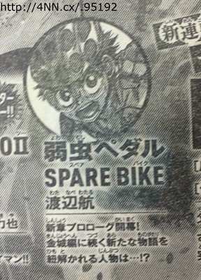 Giovedì di questa settimana, il numero di Dicembre della rivista Monthly Shōnen Champion edita dalla Akita Shoten ha annunciato che il manga spinoff Yowamushi Pedal SPARE BIKE di Wataru Watanabe entrerà in un nuovo arco narrativo a partire dal prossimo numero della rivista stessa in vendita il 12 Dicembre. Monthly Shōnen Champion non ha appositamente svelato in nome del personaggio su cui sarà incentrata la nuova storia.