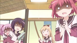 Yuruyuri è, come molti avranno già intuito un anime (tratto da un manga) del genere yuri: in esso sono centrali le relazioni sentimentali fra i vari personaggi tutti femminili. Tranquilli, siamo perlopiù sul livello di relazioni platoniche, qualche bacio e qualche abbraccio, non vi sono contenuti da fascia protetta (ci sarebbe inoltre una lunga disquisizione da fare riguardo la terminologia usata in Giappone e in occidente poichè spesso la stessa parola acquista significati differenti… ma non è questa la sede). In Yuruyuri le protagoniste, tutte studentesse della stessa scuola media (femminile), sono amiche ma alcune di esse vorrebbero essere “qualcosa di più“: non vi sono relazioni oggettive, come dicevo, poichè questi personaggi si limitano principalmente a fantasticare. Se poi prendiamo questa serie e la scomponiamo delle sue parti, tolta la sua componente yuri abbiamo un anime umoristico a tratti nonsense costruito su un semplice intreccio di una decina di personaggi. Le gag, e le battute umoristiche sono soprattutto di stampo “otaku”; altre volte invece fanno leva su iperboliche caratteristiche stereotipate dei vari personaggi. Mentirei se non dicessi che molti episodi mi hanno letteralmente fatto rotolare sul pavimento dalle risate, mentre alcuni mi hanno pressochè infastidito o annoiato. Sorprendentemente alcune gag della parte yuri sono riuscite a farmi ridere.