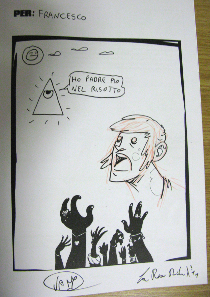 Ragazzi, e ragazze, questo era Zombie Gay in Vaticano. Io ve lo consiglio caldamente; purtroppo le 800 copie fatte preparare per il LuccaComics sono andate finite nei primi tre giorni, ma mandando una mail a [email protected] potrete prenotare la vostra copia. Cito dal blog di Davide: “Si è dovuto alzare un pochino il prezzo per via delle spese di spedizione… ma in compenso vi mandiamo, insieme al volume, anche una spilletta. In questi giorni lo rimandiamo in stampa e appena le copie sono pronte le spediamo a chi ne avesse fatta richiesta”.