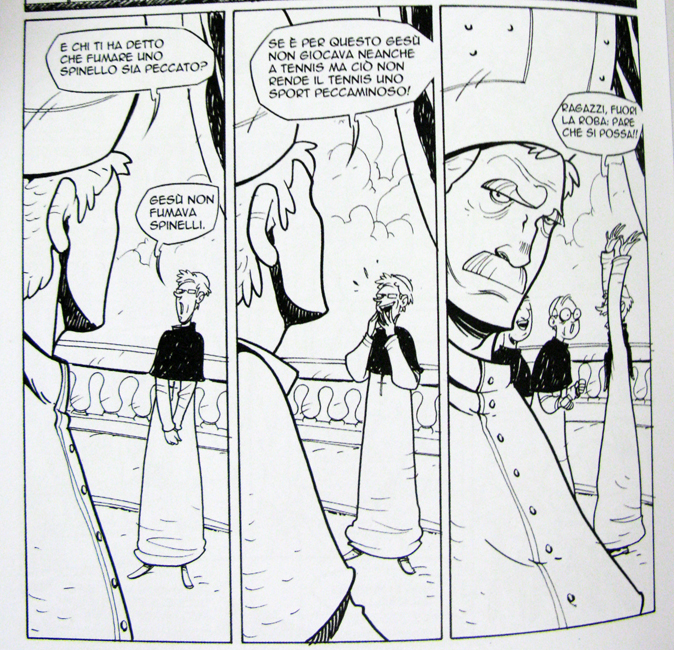 Non sapevo bene cosa aspettarmi precisamente ma quanto mi son trovato davanti è stato sia sorprendente che rassicurante. Rassicurante perchè, man mano leggendo la storia le caratteristiche più peculiari di Davide vengono fuori e sono rintracciabilissime in monologhi e battute dei personaggi. Per esempio il monologo del Papa sul perchè non si possono uccidere gli zombi è specchio del giovane Davide, come il ragionamento sulla non peccaminosità della marijuana è simile alla logica messa in atto dal personaggio di Dio. Per non parlare delle trovate fuori dal mondo come la necessità di un alieno di spiegare la sua natura come quella di un “turco spaziale” a degli uomini del medioevo. La storia è semplice, lineare e ben costruita ma soprattutto farcita con delle trovate folli.