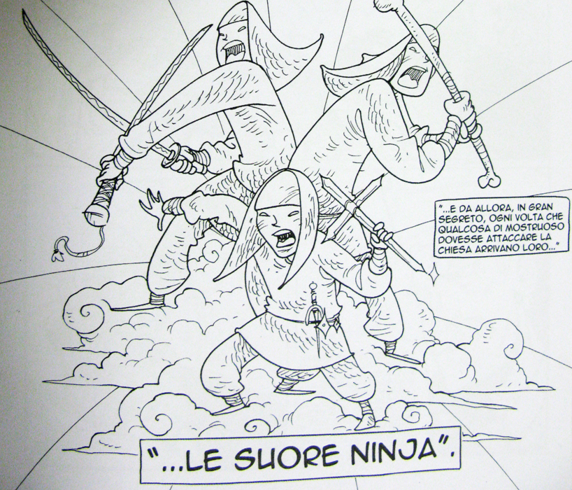 Ci sono però anche dei tratti del racconto che fanno sorridere per altri motivi: il personaggio del Papa è quanto di più lontano esista dall’ideale del Papa comune, eppure è terribilmente realistico per come è realizzato. Non aggiungo troppo perchè sennò vi spoilero tutta la storia. E non dico nulla riguardo l’introduzione alla storia fatta da Pegasus di Saint Seya, o alla descrizione dell’addestramento necessario per diventare una Suora-Ninja. Non mi soffermo su quelli che sarebbero i “temi portanti” dell’opera perchè, oltre che a scoprirli voi stessi, avrete modo di affrontarli per conto vostro senza che il sottoscritto venga a farvi la morale su temi come fede, omosessualità, a more e religione. Eh già, qui non ci sono solo zombie e suore combattenti!